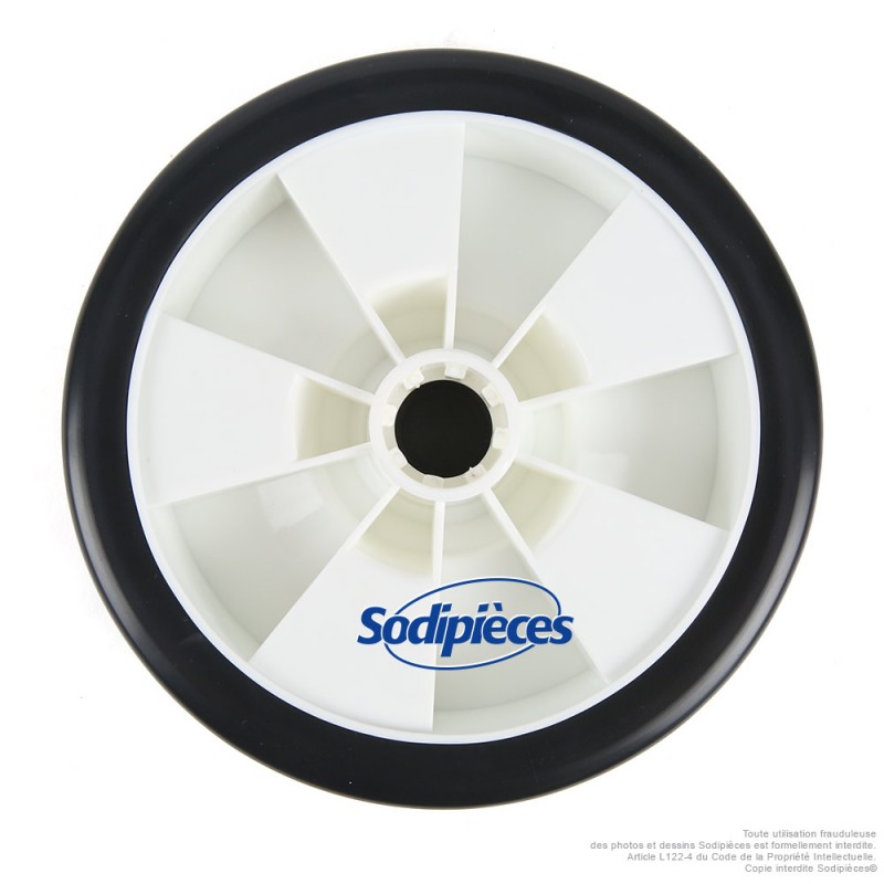Roue de tondeuse universelle - Ø 200 mm - largeur bande roulement 50. Livrée avec un jeu de 3 bagues diamètre 9,8 ; 13 et 14,5 mm.