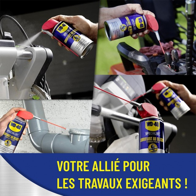 Le Lubrifiant au Silicone WD-40 SpecialistTM bénéficie d’une formule n’attirant pas les salissures et dotée d’excellentes propriétés lubrifiantes pour permettre le mouvement des pièces. Il assure à la fois une isolation contre l'humidité et une protection anticorrosion après un séchage rapide. Sa formule est compatible sur tous les métaux, plastiques, caoutchoucs et bois. Elle évite les frictions et le grippage des pièces mobiles avec de hautes performances en cas de fortes pressions. Le Lubrifiant au Silicone WD-40 SpecialistTM résiste à des températures pouvant aller jusqu'à 200°C.