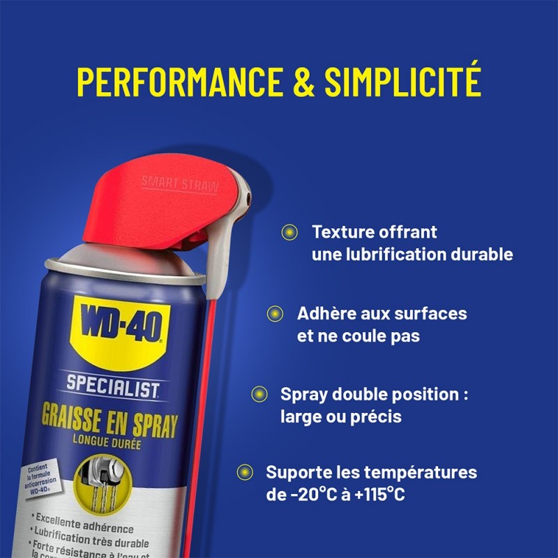 Pour les professionnels qui exigent le meilleur en termes de performance et de protection pour leur équipement, la Graisse en Spray Longue Durée WD-40 Specialist est la solution idéale. Elle assure une maintenance efficace et durable, réduisant les coûts opérationnels tout en prolongeant la vie utile du matériel. Fiable et facile à utiliser, elle est conçue pour vous donner une tranquillité d'esprit totale dans la gestion quotidienne de vos opérations.