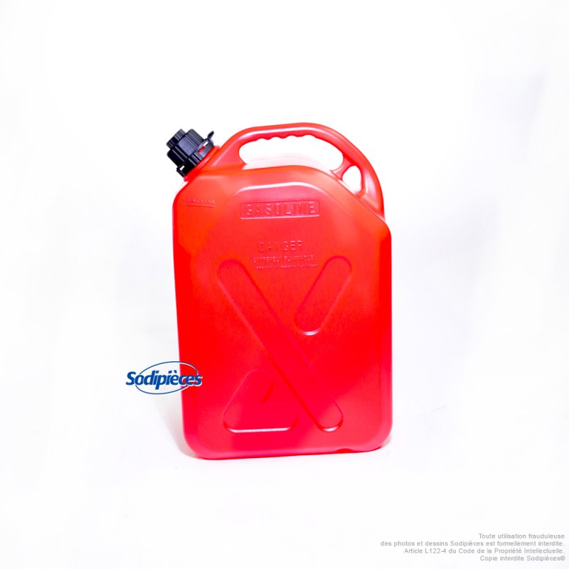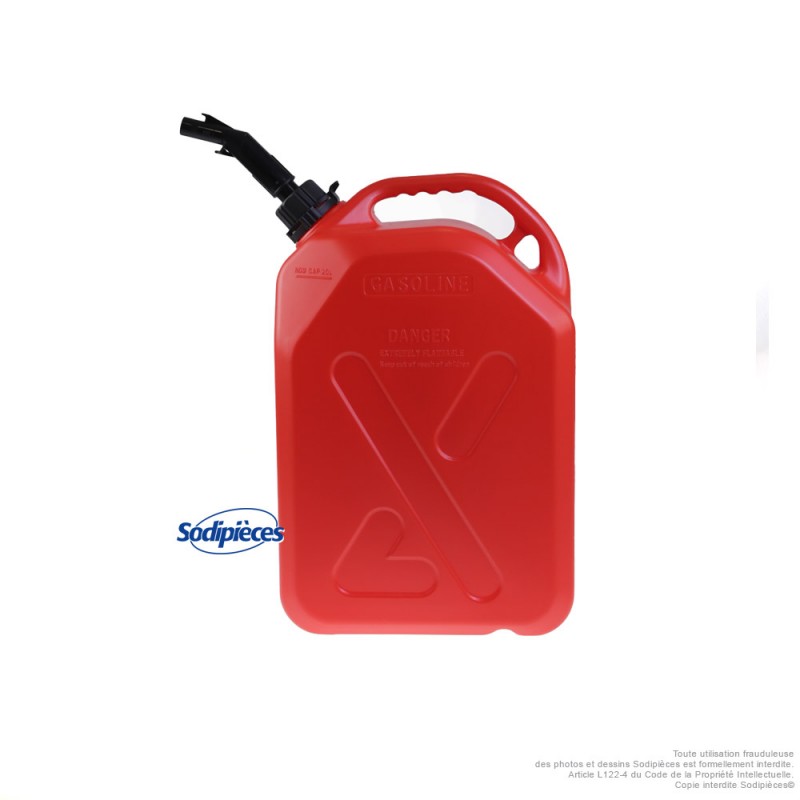 Bidon en plastique rouge et noir de 20L, équipé d'un bec verseur intégré. Parfait pour le transport et le stockage de carburant, d'huile ou d'eau. Durable et facile d'utilisation.