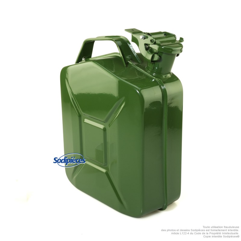 S’il est copié sur le modèle allemand, il est aussi amélioré. Son orifice de versement est modifié afin de pouvoir y adapter un bec verseur souple et une prise d’air automatique est ajoutée pour permettre de le vider plus rapidement. Le jerrican américain est fabriqué en tôle d’acier ; de couleur verte kaki, jaune sable ou noire ; sa contenance est de 20 litres soit 5 galons US (18,93 litres) ; ses dimensions sont 47 x 35 x 18 cm.