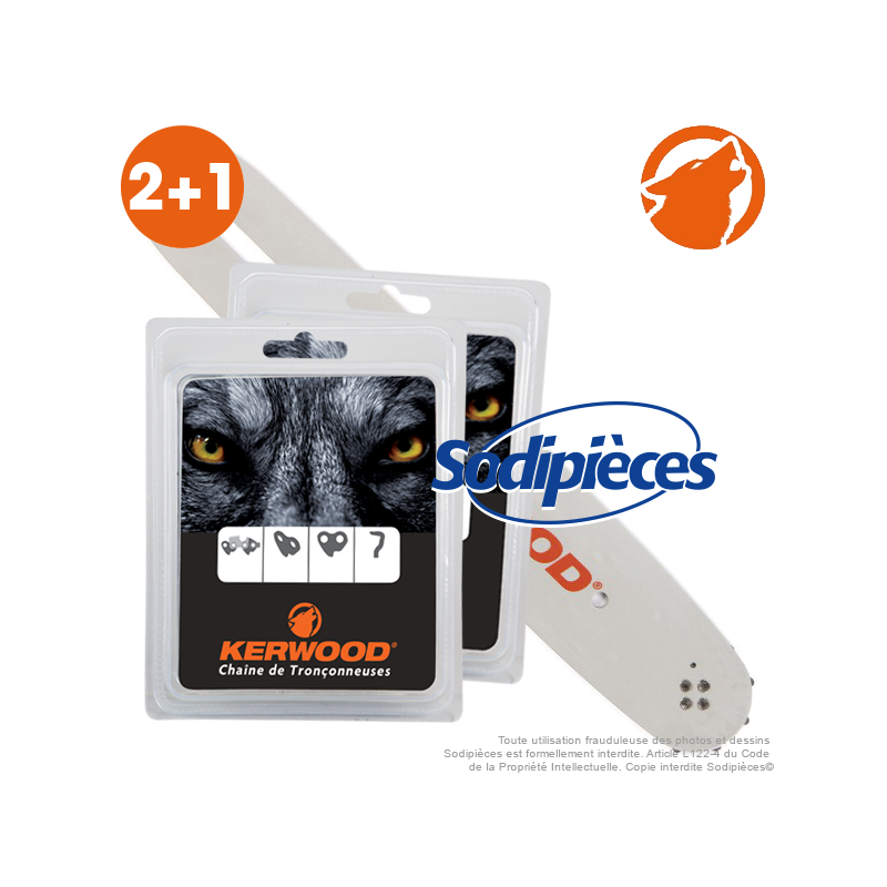 Kit 1 guide. 38 cm. 0,325”. 1,5 mm. 15C3KSWA + 2 chaînes 64 maillons 0.325”, 1,5mm. Kerwood