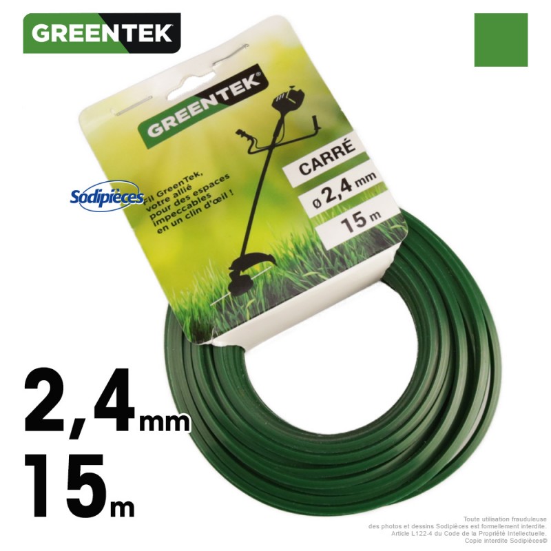 Fil carré Greentek pour débroussailleuse.Le fil Greentek est compatible avec les débroussailleuses thermiques, à batterie ou filaires.Compatible également avec les têtes débroussailleuses à brins ou les têtes automatiques de type Tap & Go et Greentek.