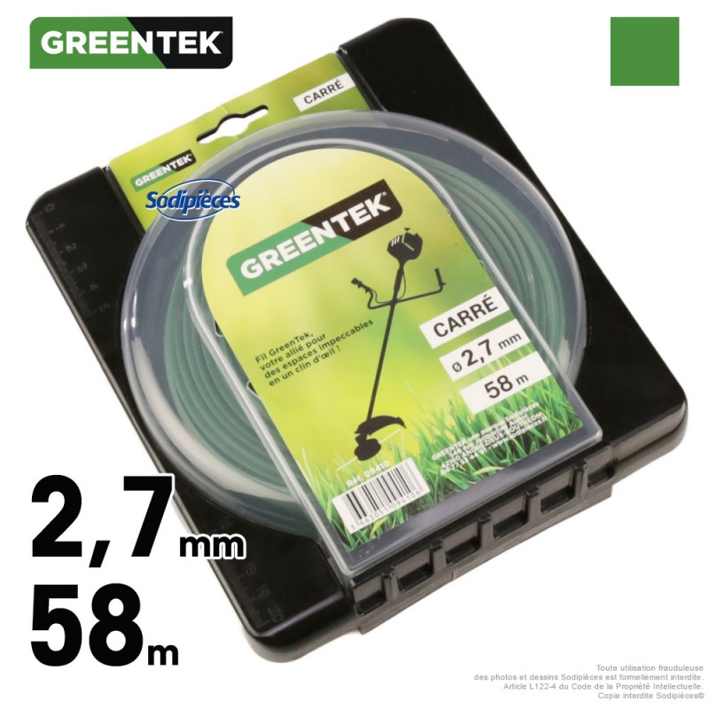 Fil carré Greentek pour débroussailleuse. Le fil Greentek est compatible avec les débroussailleuses thermiques, à batterie ou filaires. Compatible également avec les têtes débroussailleuses à brins ou les têtes automatiques de type Tap & Go et Greentek.