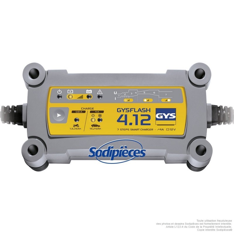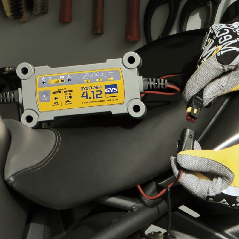 Le GYSFLASH 4.12 est particulièrement recommandé pour la recharge des batteries moto, jet-ski, karting et véhicule léger en 12 V.